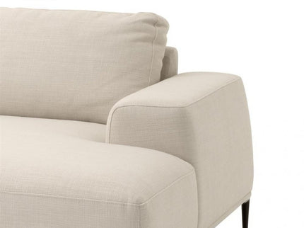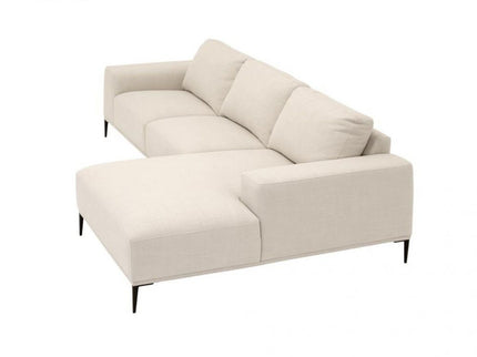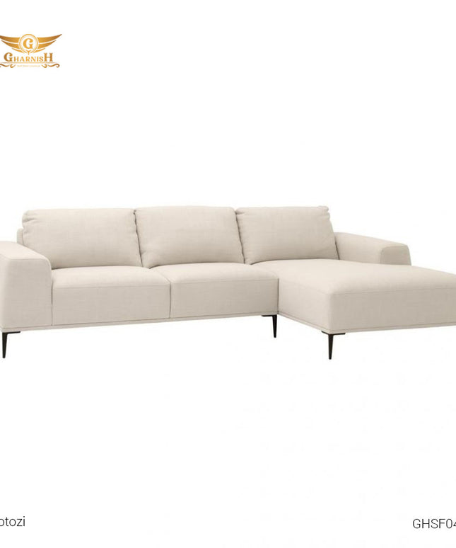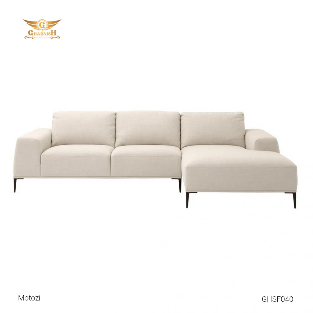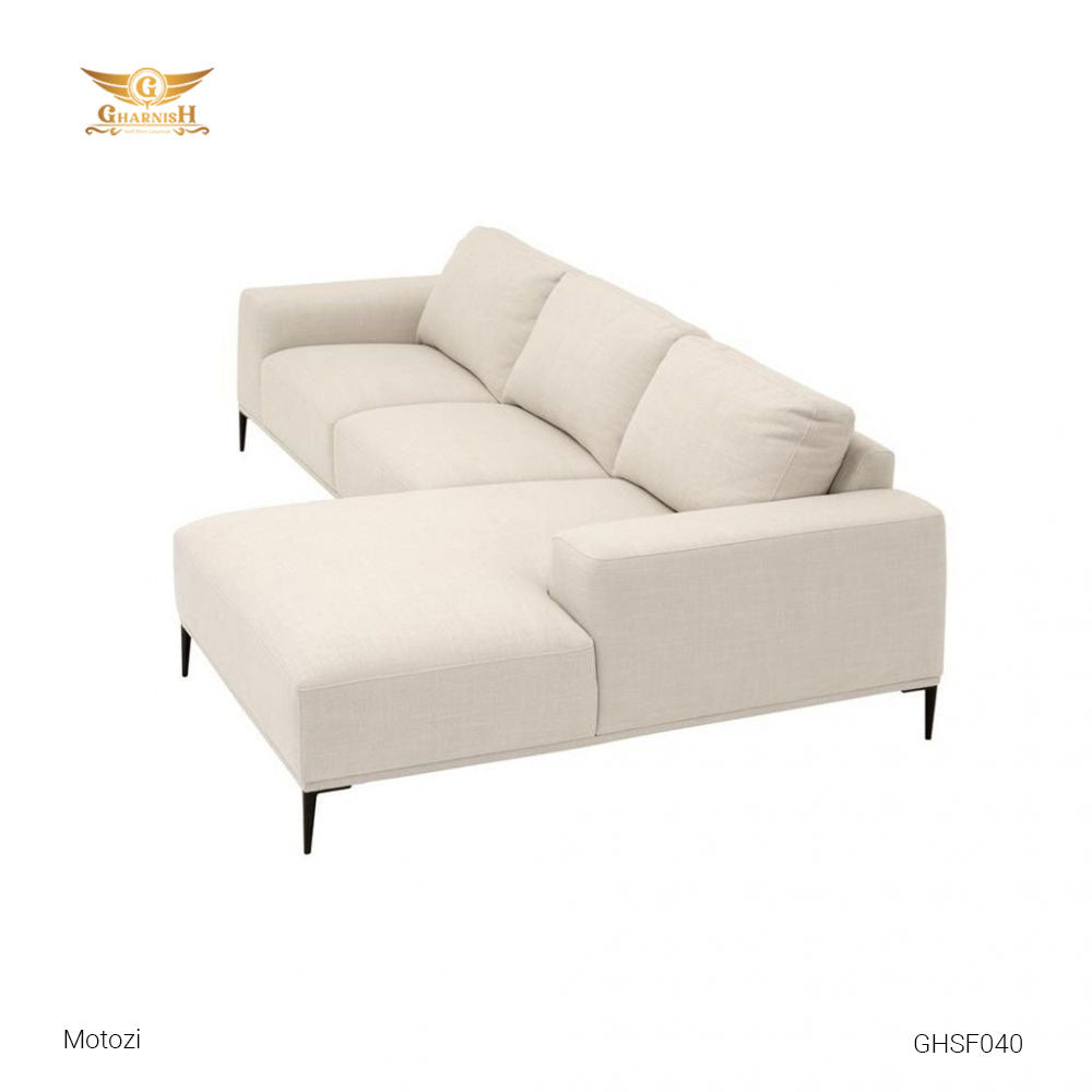 The contemporary shape of the Motozi Sofa from Gharnish - Luxury sofa makers in Hyderabad, really helps it stand out from the crowd, it got its oversized arms and sharp metal legs. The overfilled back cushions provide a sumptuous seat you won't want to get up from, and the added chaise makes lounging even more appealing.