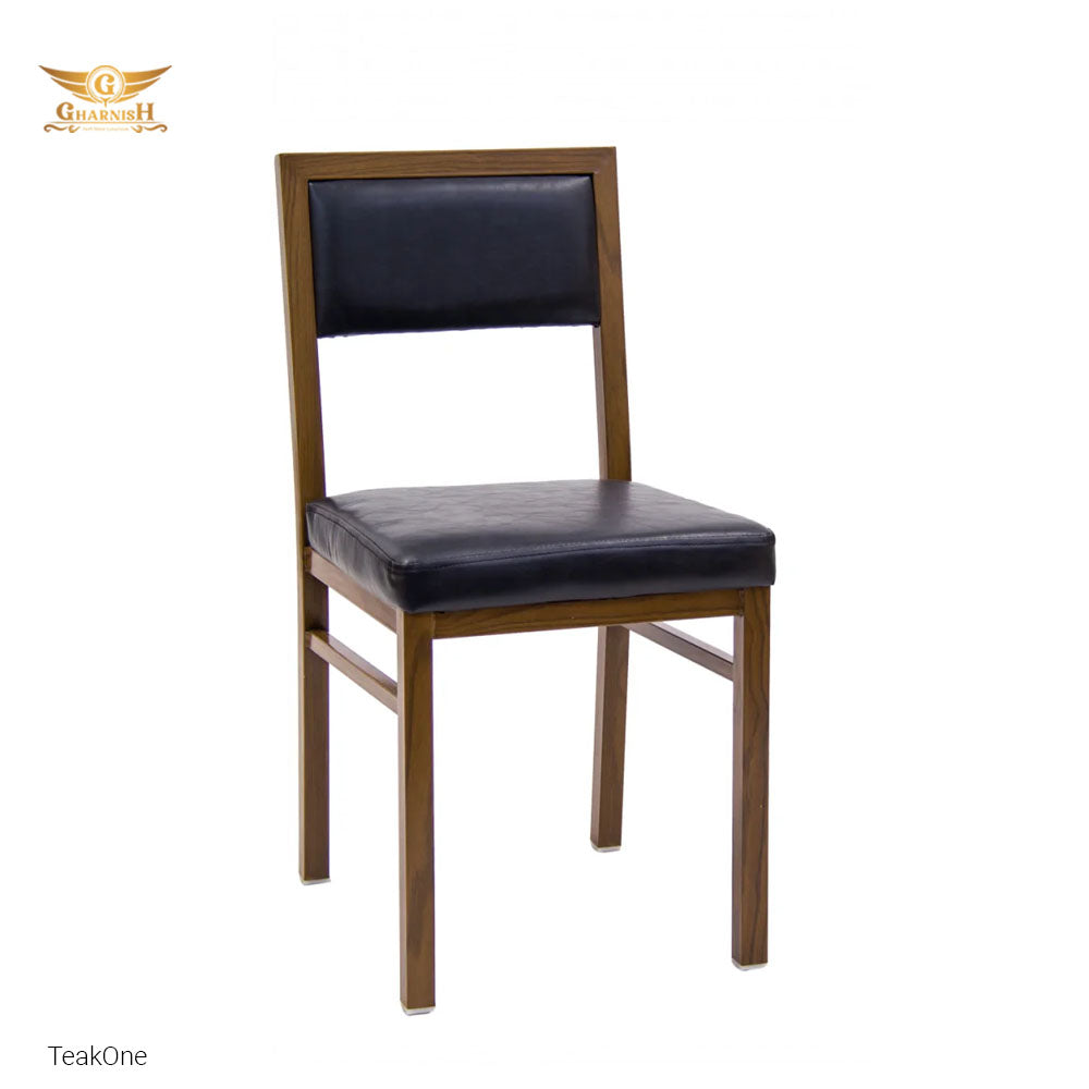 The Teakone restaurant dining chair made with teakwood and black leatherette with soft cushioning. It lends a rustic and upscale look with it's walnut frame finish complimented by the black vinyl padded seat and backrest.