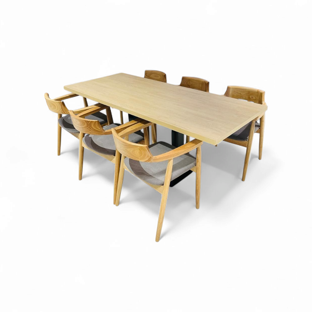 Enjoy mealtime with the Tinder Light 6 Seater Set, where comfort meets style! This playful dining set features cushioned wooden chairs with armrests and a sleek wooden backrest design. The sturdy plywood laminated tabletop rests on a heavy-duty two-pillar MS base, blending wood and metal for a modern, durable look. Perfect for lively dinners or cozy gatherings, this six-seater set brings a fun, contemporary vibe to any space while ensuring lasting comfort and strength.